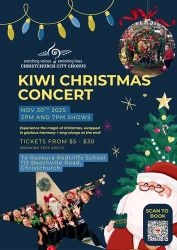 Kiwi Christmas Concert Matinee Basic event infoEvent date: Sun 30 Nov 2025, 02:00PM to 04:00PMLocation: Te Raekura Redcliffs School 113 Beachville Road Christchurch New Zealand See map: Google Maps NZ Public event fieldsGet ready to kick off the festive season with harmony, joy, and a touch of Kiwi Christmas cheer! Christchurch City Chorus presents A Kiwi Christmas — a sparkling celebration of quartets, chorus favourites, and a lively dash of festive fun. Choose your performance: Afternoon 2pm (with guest performers from Redcliffs Primary School) – a family-friendly show bursting with youthful energy and festive spirit. Evening 7pm – a magical night of harmony and Christmas sparkle. And because no Kiwi Christmas is complete without it… we’ll finish with a good old-fashioned carol singalong. Bring your singing voice! We’ll also have festive Christmas raffles and food for sale - cash or EFTpos available. Bring your whānau, invite your friends, and join us for an unforgettable celebration of music and Christmas spirit. Tickets available through Humantix.