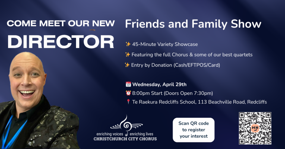 Friends and Family Show and Rehearsal Basic event infoEvent date: Wed 29 Apr 2026, 08:00PM to 08:45PMLocation: Redcliffs School Auditorium New Zealand See map: Google Maps NZ Public event fieldsThe chorus and quartets are preparing to attend the regional Sweet Adelines Convention being held next month in Palmerston North. The chorus will be evaluating-only with the view to compete at regionals next year. The chorus would like to invite you to a friends and family show being held on Wed April 29th at our rehearsal rooms, Redcliffs School 113 Beachville Road, Redcliffs. This will be an opportunity to introduce you to our new incoming director, Ryan Heller, and to present our two competition songs. This is also a chance for our competing quartets to perform. The show will start at 8:00pm and will run for 45 minutes. See the attached flyer for details. Please click on this link Meet our new Director! to donate and register for the show.